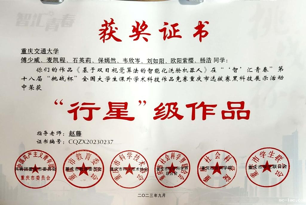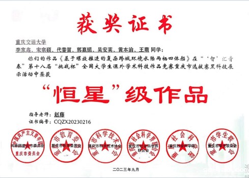 此前,我校5项作品在重庆市选拔赛中获奖并推送至国赛,航运学院两件作品在重庆市选拔赛中分获“恒星”级称号和“行星”级称号,赵藤老师荣获“优秀指导老师”称号。
