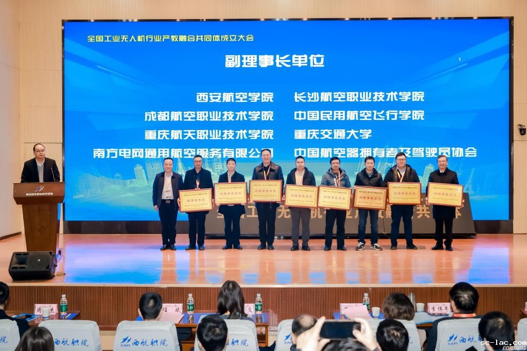 12月5日,“全国工业无人机行业产教融合共同体”成立大会在西安航空职业技术学院顺利召开。共同体在教育部、陕西省教育厅、四川省经济和信息化厅等部门的指导和支持下,由成都纵横自动化股份有限公司、西北工业大学、西安航空职业技术学院牵头成立,来自全国本科高校、职业院校,科研院所及行业企业的近百名嘉宾代表齐聚一堂,共同推动工业无人机领域产教融合、科教融汇,促进产教深度融合。老伟德网上娱乐航空学院副院长邓涛和对外合作交流办主任董永武代表老伟德网上娱乐应邀参加,在大会上,老伟德网上娱乐当选为副理事长单位,学院副院长邓涛代表学校领取牌匾。