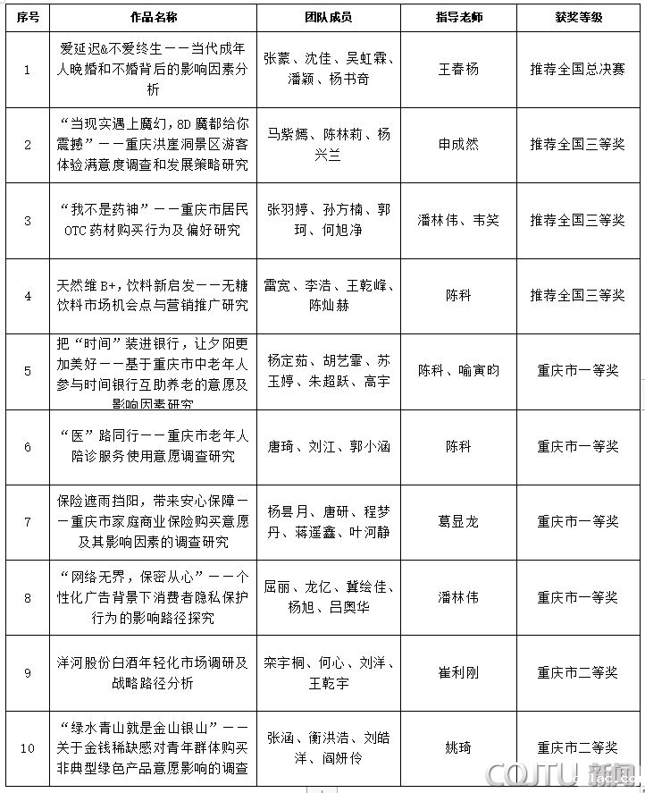 2024年4月14日,“正大杯”第十四届全国大学生市场调查与分析大赛重庆赛区选拔赛在重庆师范大学数学科学学院成功举行。我校10支代表队有4支入选答辩赛,获推荐全国总决赛1队,推荐全国三等奖3队,重庆市一等奖4队、二等奖2队。