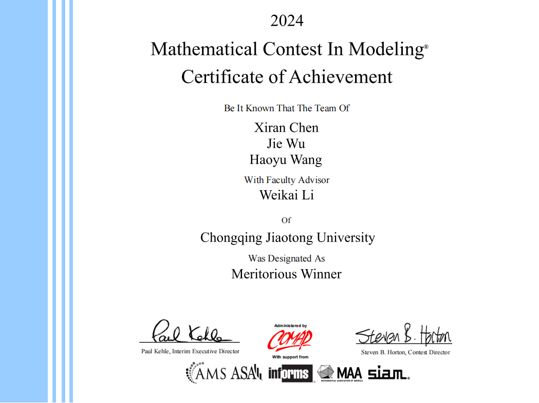 近日,2024年美国大学生数学建模竞赛(MCM/ICM)成绩正式揭晓。我校在本次竞赛中再创佳绩,荣获国际一等奖(Meritorious Winners)4项、国际二等奖(Honorable Mention)10项。