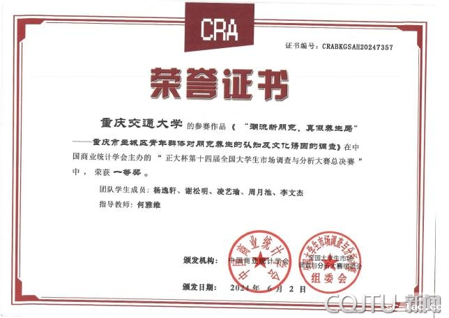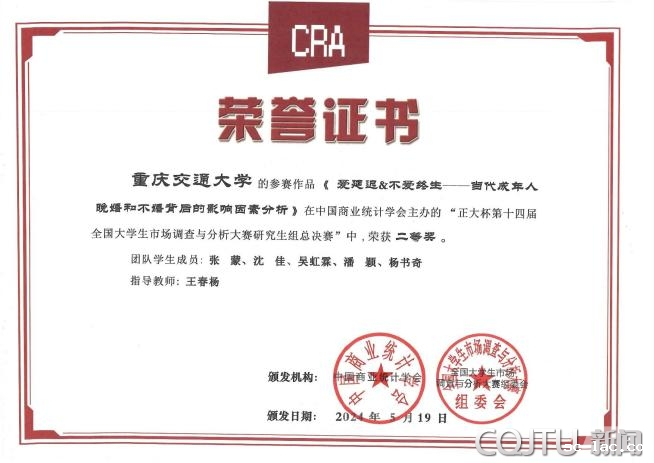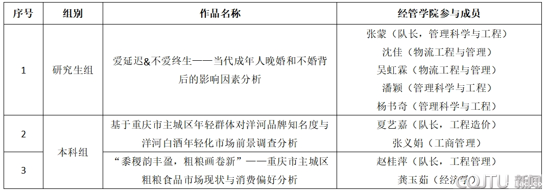 获奖作品主题涉及晚婚不婚、朋克养身、粗粮食品和洋河白酒品牌等,获奖团队成员来自经管学院、信息学院、数统学院、交通运输学院、机电学院、土木学院等。本次大赛校赛由经管学院组织,47支研究生队伍参加校赛,其中10支晋级重庆市赛,1支晋级全国总决赛;64支本科生队伍参加校赛,其中23支队伍晋级重庆市赛,3支队伍晋级全国总决赛。