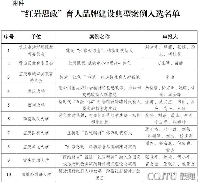 近日,中共重庆市委教育工作委员会办公室印发《中共重庆市委教育工作委员会办公室关于公布“红岩思政”育人品牌建设典型案例入选名单的通知》(渝教工委办函〔2024〕18号),公布“红岩思政”育人品牌建设典型案例30件。我校马克思主义学院张晓平教授团队报送的《“四维融合”推进“红岩精神”融入全国高校思政课教师实践研修模式理论与实践》成功入选。