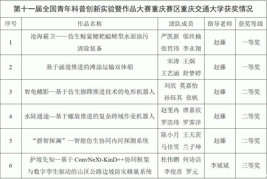 此次系我校第二次参与该项赛事,经专家网络盲审遴选,共有6组作品晋级复赛现场答辩环节。经过激烈角逐,我校团队最终斩获重庆市一等奖2项、二等奖3项、三等奖1项,获奖总数位居全市参赛高校榜首。