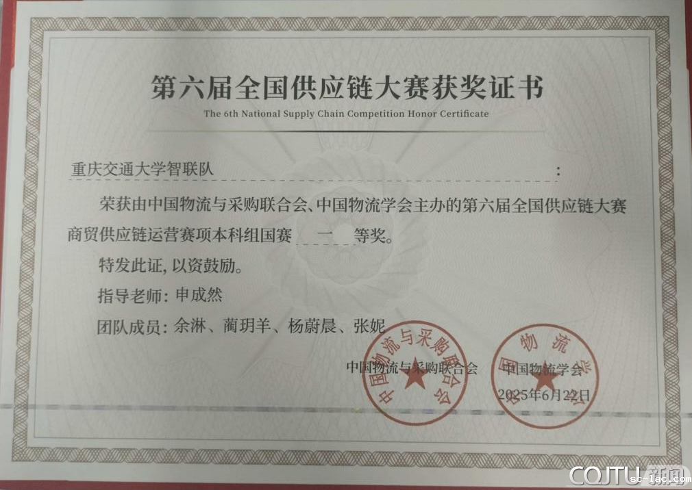 6月22日,由中国物流与采购联合会、中国物流学会主办的第六届全国供应链大赛决赛在江苏南通落下帷幕。老伟德网上娱乐经管学院物流管理系主任申成然指导的智联队(队员:余淋、蔺玥羊、杨蔚晨、张妮)荣获全国一等奖。