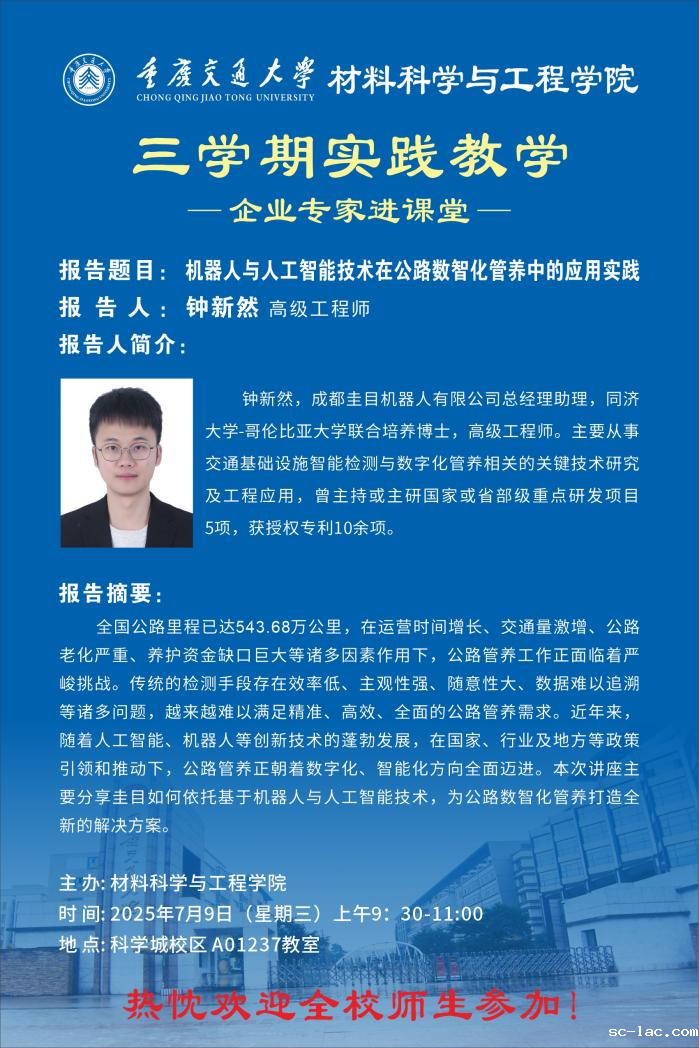 2024级大一本科生培养以“认识实习”为载体,通过沉浸式体验构建材料认知体系。从走进海康威视,直观感知机器视觉和大模型规模化应用,到深刻领悟数字化产品跟着场景走,解决具体问题。从校园建材的“触摸感视”多维感知,到《沥青与沥青混合料的过去、现在与未来》、《阻燃高分子与火安全电池》、《新能源材料与器件—破解能源危机与环境污染的金钥匙》等系列前沿讲座,在初步领略材料魅力的同时,走进材料分析测试中心,实现理实深度融合。企业专家讲堂(成都圭目机器人有限公司钟新然高工)与交通土建工程材料国家地方联合工程研究中心参访则进一步拓展了学生行业视野,培育了创新萌芽。