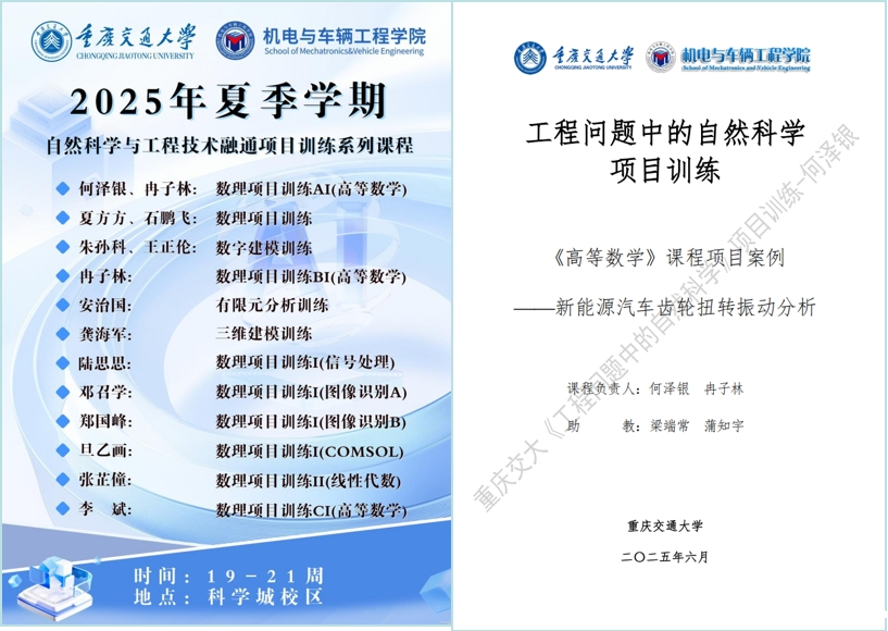 学院成立了《自然科学与工程技术融通项目训练》教学团队,围绕《高等数学》《线性代数》《大学物理》《流体力学》《计算力学》等自然科学课程中的“微分方程、泰勒级数、特征向量、梁板受力”等知识,开发了“新能源汽车高速齿轮振动控制、智能车辆图像识别、振动激励连续化处理”等工程项目,陪伴学生从数理知识掌握到能力跃迁成长,以30000r/min新能源高速电机齿轮扭振异常等工程真场景问题,开展项目真题真做实践,破解“学用脱节”壁垒。