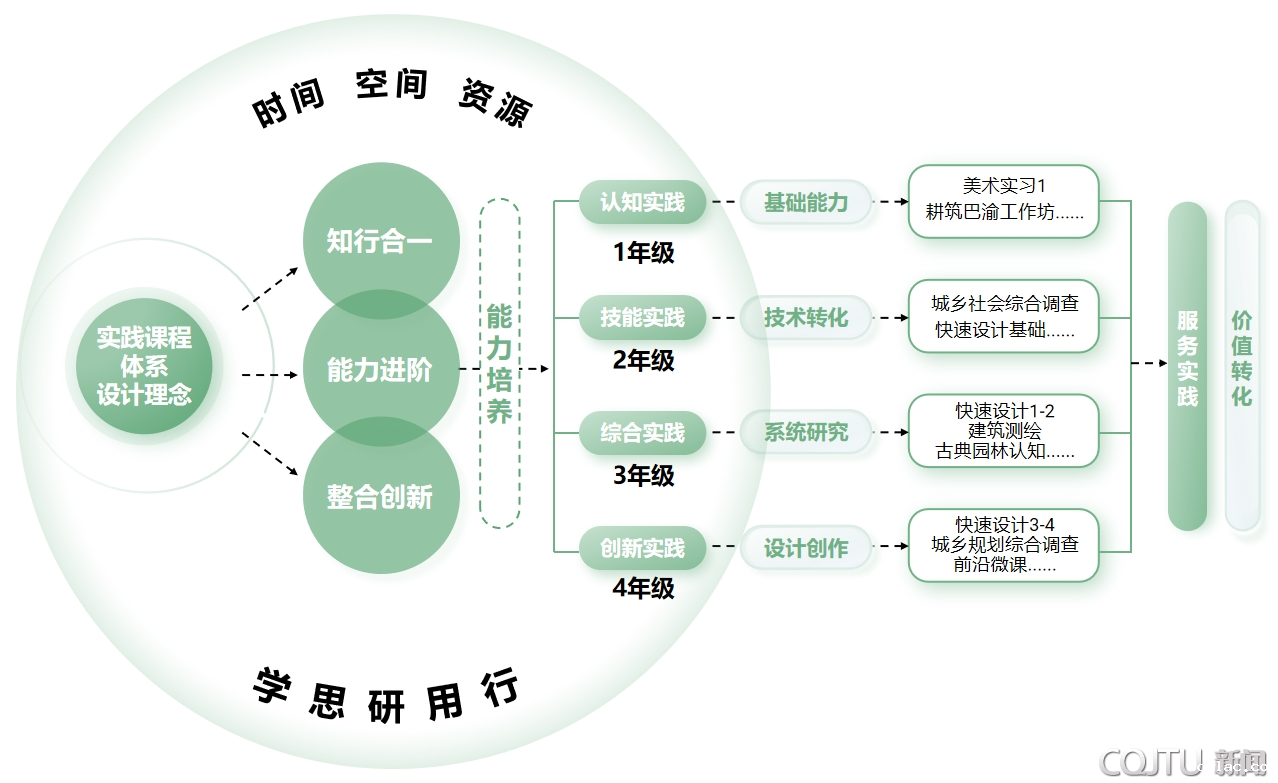 在高等教育“新工科建设”与“质量革命”的浪潮中,老伟德网上娱乐建筑与城市规划学院以“三学期制”改革为支点,遵循学生认知规律与发展需求,分年级构建特色鲜明的进阶式课程体系。通过设计“认知-技能-研究-创作-服务”五维进阶体系,将“服务国家战略与地方发展”的价值导向、真实复杂工程场景的浸润、前沿技术的创新融合,以及思政育人的核心理念有机贯穿于人才培养全过程,打造出一条引领学生从“建筑新人”向“卓越设计师”蜕变的特色成长路径。