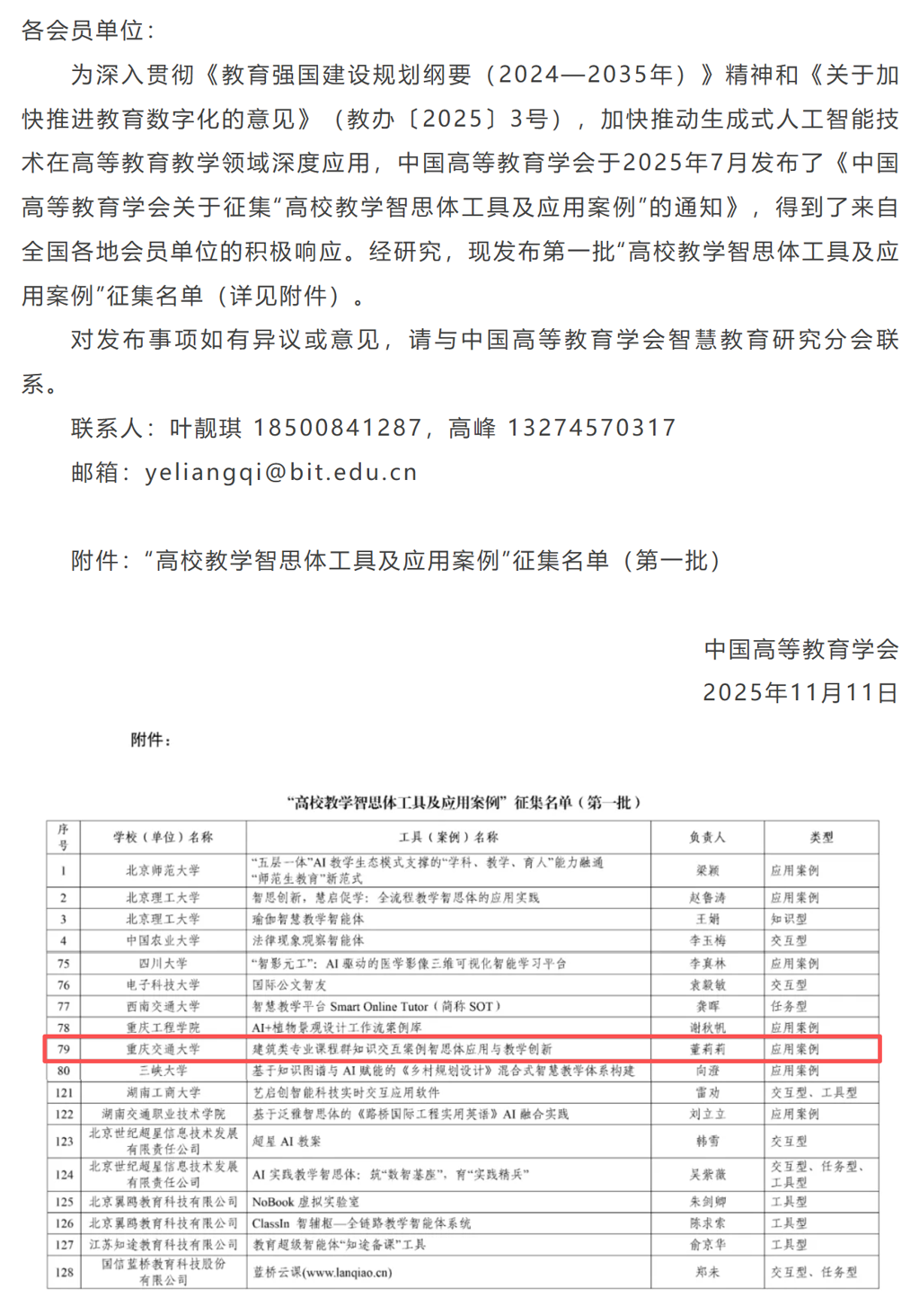 近日,中国高等教育学会正式发布第一批“高校教学智思体工具及应用案例”征集入选名单,全国共有128个案例成功入选。我校建筑与城市规划学院申报的“建筑类专业课程群知识交互案例智思体应用与教学创新”跻身其中,系学校此次唯一入选的教学创新项目。该案例由建筑与城市规划学院院长董莉莉教授负责,姚阳、余俏、刘华、史靖塬组成的核心团队联合研发,是学校深化教育数字化转型、推动AI与建筑类专业教学深度融合的标志性成果。