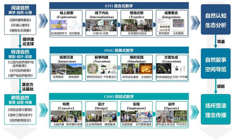 立足工科办学特色,对标行业人才能力模型,创新构建“阅读自然—转译自然—耕筑自然”三阶递进的课程体系。贯通从生态认知、空间叙事到场所营造的全链条教学内容,旨在培养兼具跨学科知识、专业设计能力与运营管理素养的复合型“T”型人才,使学生实现从感知自然、理解自然到传达自然、营造自然体验的跨越式成长。