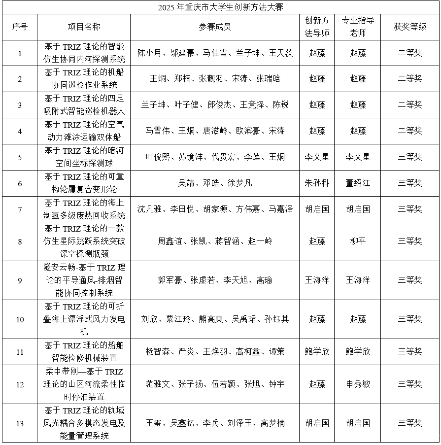 此次斩获多项奖项,是我校长期践行“以赛促学、以赛促教、以赛促建”育人理念的又一重要成果。近年来,我校高度重视创新方法教育融入人才培养全过程,通过鼓励学生参与各类创新赛事、搭建科研实践平台,着力培养学生运用专业理论解决实际问题的创新能力,为输送高素质创新型人才奠定了坚实基础。未来,我校将持续深化创新教育改革,强化创新方法教学与学科实践的融合,助力更多学子在科技创新领域持续突破,为重庆乃至全国的创新发展贡献交大学子的青春力量。