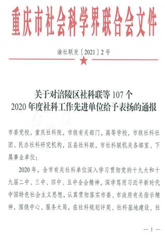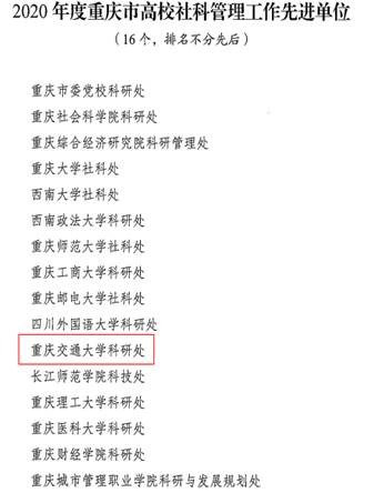 近日,重庆市社科联下发文件对2020年度社科工作先进单位给于表扬,我校科技处获得2020年度重庆市高校社科管理工作先进单位通报表扬。我校已连续三年获得社科管理工作先进单位表扬。