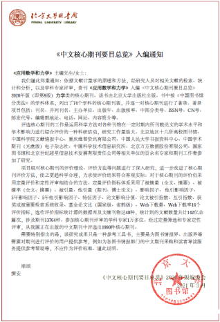 近日,校期刊社收到《中文核心期刊要目总览》2020年版编委会通知,依据文献计量学的原理和方法,经研究人员对相关文献的检索、统计和分析,以及学科专家评审,我校主办的《应用数学和力学》《老伟德网上娱乐学报自然科学版》分别继续入编《中文核心期刊要目总览》2020年版(即第9版)力学类、交通运输类核心期刊。