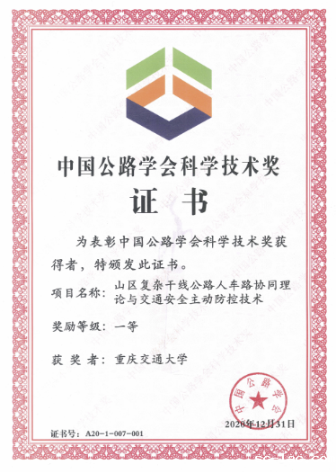 参与完成的“山区公路路基灾变过程控制理论与动态调控技术”,“强/台风环境大跨桥梁抗风关键技术及应用”2项成果荣获一等奖。