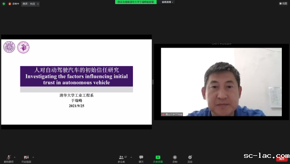 中国人类工效学学会秘书长、清华大学工业工程系于瑞峰教授作“人对自动驾驶汽车的初始新任研究”专题报告。