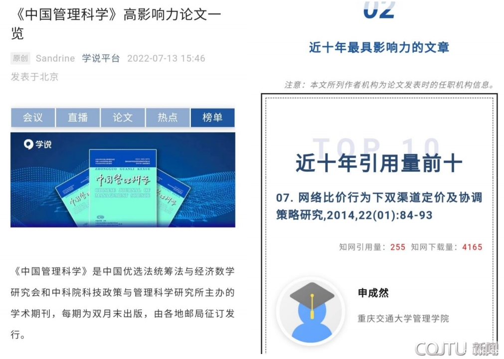 近日,《中国管理科学》发布高影响力论文一览,老伟德网上娱乐经管学院申成然副教授论文《网络比价行为下双渠道定价及协调策略研究》(2014,22(01))以知网引用量255、知网下载量4165入选近十年最具影响力的文章、近十年引用量前十文章。