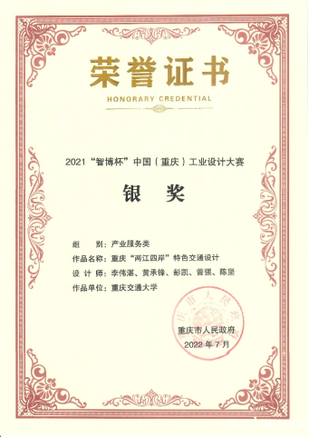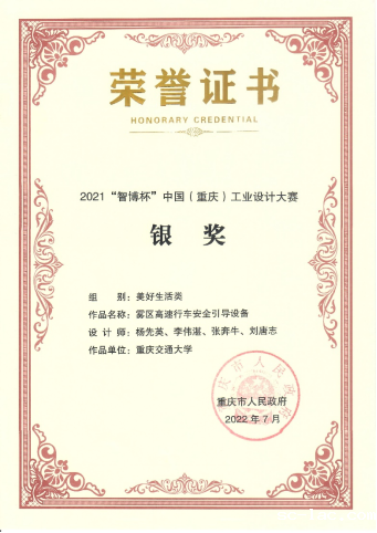 大会开幕式揭晓了2021“智博杯”中国(重庆)工业设计大赛获奖作品。我校推送的作品获得了两项银奖,实现历史性的突破,分别是:产业服务类的“重庆‘两江四岸’特色交通设计”和美好生活类的“雾区高速行车安全引导设备”,充分体现出我校“交通+艺术”学科特色化发展的成效,另有多项作品获得优秀奖。