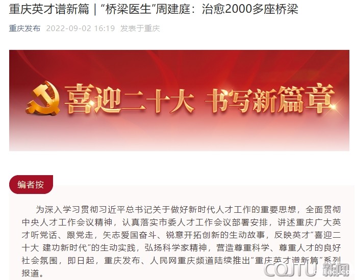 为深入学习贯彻习近平总书记关于做好新时代人才工作的重要思想,全面贯彻中央人才工作会议精神,认真落实市委人才工作会议部署安排,讲述重庆广大英才听党话、跟党走,矢志爱国奋斗、锐意开拓创新的生动故事,反映英才“喜迎二十大 建功新时代”的生动实践,弘扬科学家精神,营造尊重科学、尊重人才的良好社会氛围,即日起,重庆发布、人民网重庆频道陆续推出“重庆英才谱新篇”系列报道。