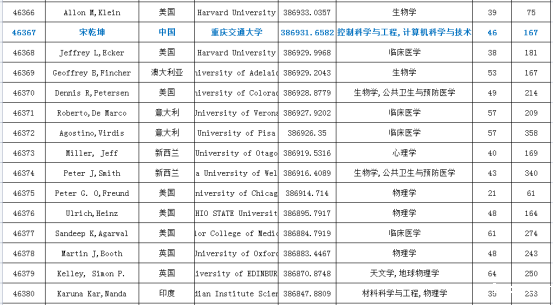 2022年8月31日,《2022全球学者学术影响力排行榜》正式发布,公布了全球前10万名学者名单,中国上榜学者数为9044人,仅次于美国,排名全球国家第二。我校数学与统计学院宋乾坤教授进入榜单,以论文总评分386931.658151、 H指数46、论文数167,获全球排名46367位。