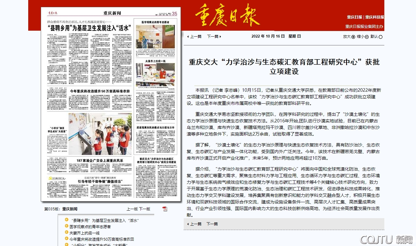 “力学治沙与生态碳汇教育部工程研究中心”获批教育部工程研究中心。我校“力学治沙与生态碳汇教育部工程研究中心”经过多轮专家评审及答辩成功获批立项建设,该工程研究中心也是重庆市市属高校本年度唯一获批的教育部科研平台。该平台的立项建设实现了我校高层次科研平台的新突破,提高了我校科技创新能级,推动了学校“十四五”科技事业的快速发展,加快了传统交通学科科研方向的绿色化转型,为我校生态力学交叉学科建设、复合型创新人才的培养提供了有力支撑,为经济社会高质量发展作出了重庆交大贡献。