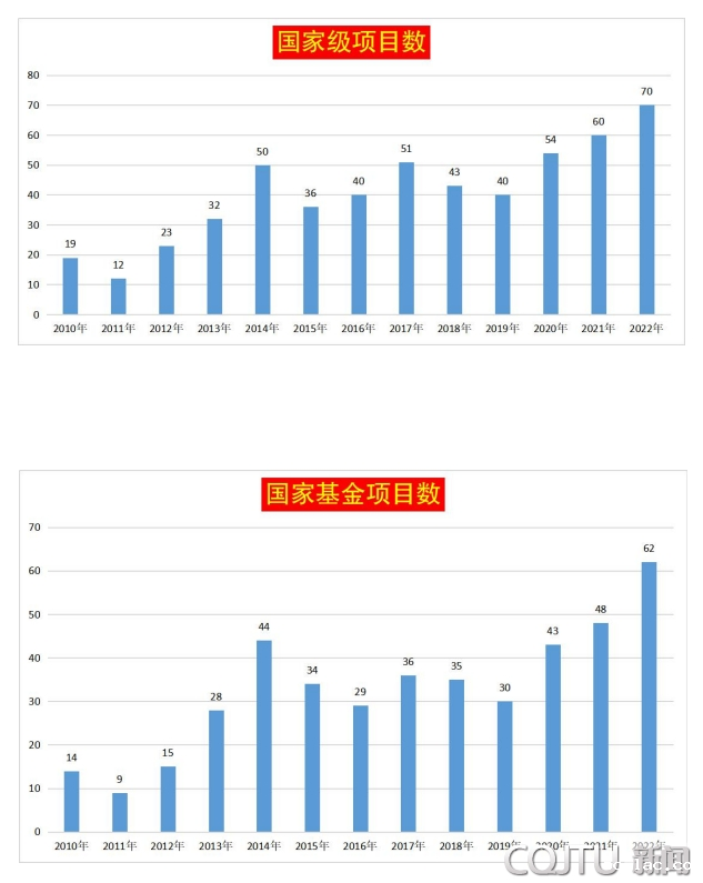 2022年,国家级项目立项数创历史新高,国家自然科学基金项目首次突破50项大关。主持和参研国家级科研项目70项,其中包括国家自然科学基金51项,立项数量同比增长21%,直接资助经费2109万元,同比增长38%,国家基金项目数和经费数均创历史新高。