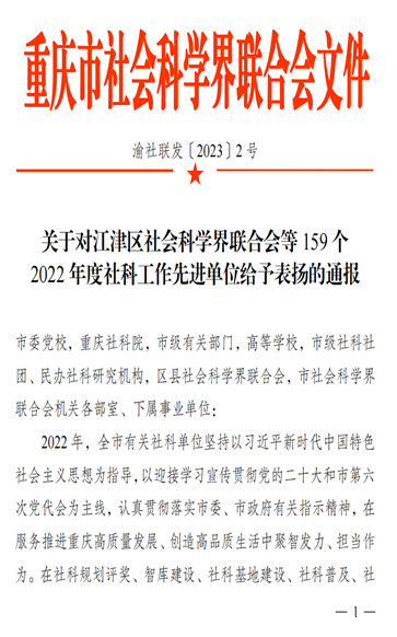 近日,重庆市社会科学界联合会发布了《关于对江津区社会科学界联合会等159个2022年度社科工作先进单位给予表扬的通报》(渝社联发〔2023〕2号),我校人文社科研究中心获评“2022年度重庆市高校社科管理工作先进单位”,建筑与城市规划学院人文社科普及基地获评“2022年度重庆市人文社会科学普及基地(示范点)工作先进单位”。