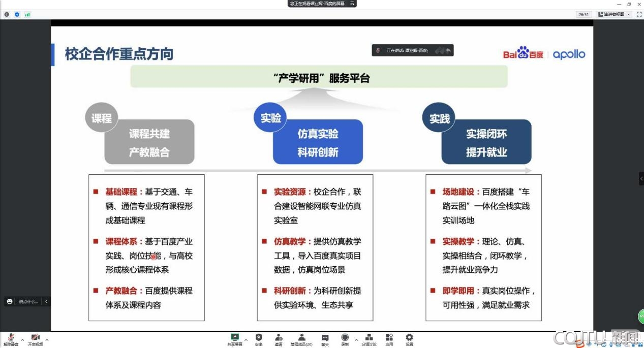新年新气象,开新局谋新篇,交通运输学院与百度智行信息科技(重庆)有限公司全方位合作发展研讨会于1月18日下午线上举行。出席研讨会的有百度车路协同首席科学家和百度智能驾驶事业群总监王淼、百度教育文旅行业总监秦绪锋、交通运输学院代理院长刘唐志、副院长陈坚、院长助理蒋军和段力伟,以及百度公司相关职能部门负责人和交通运输学院智慧交通系、交通工程系、交通设备与控制工程系部分专家教授代表等十余人。
