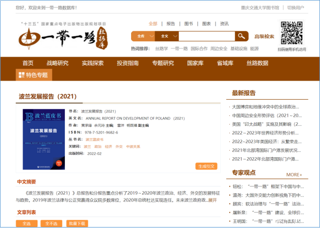 “一带一路”倡议数据库由中国社会科学院旗下的社会科学文献出版社创建,该数据库收录文献资源涉及“一带一路”倡议与大国地缘战略、“一带一路”倡议沿线的区域合作机制、“一带一路”倡议与互联互通等当前的热点专题内容。同时,还不断整合公共信息与公开资源,汇集与“一带一路”倡议战略相关的实时新闻、专家观点、学界动态、智库成果、企业动态、外媒评论等媒体资讯信息。