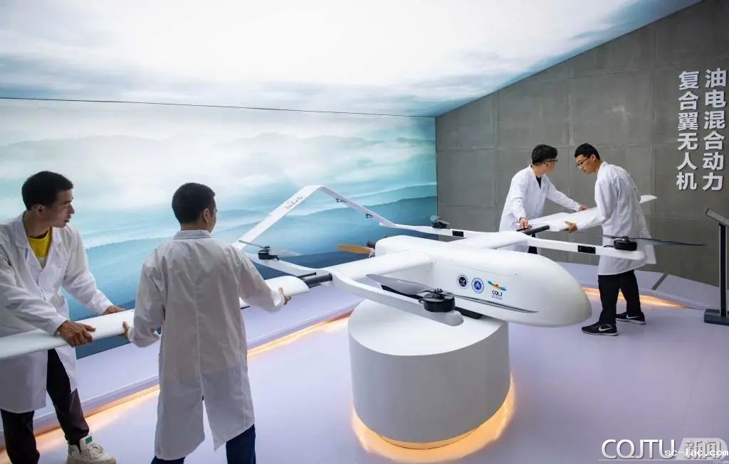 (资料图:“绿航院”通航飞行器及中小型航空发动机测试试飞中心研发人员正在展厅组装油电混合动力复合翼无人机)
