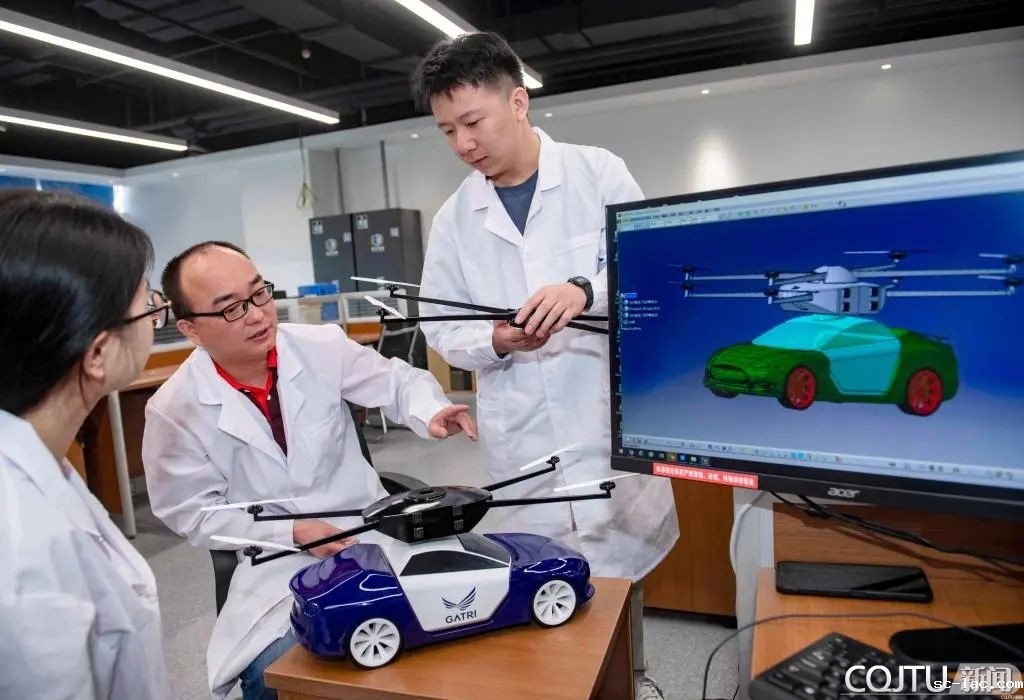 (资料图:“绿航院”绿色航空飞行器研究所科研人员正在讨论垂直起降飞行汽车的旋翼旋转机构设计方案。)