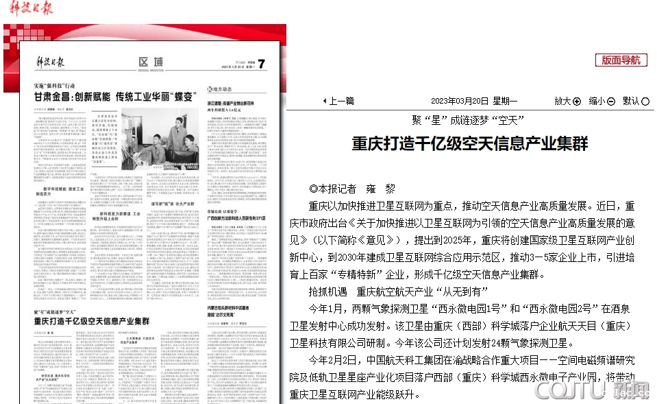 《意见》提出,重庆市将重点围绕“不断完善卫星互联网发展体系、加快通导遥融合率先建成综合应用示范区、推动补链成群着力打造空天信息产业集群”这三个方面进行。