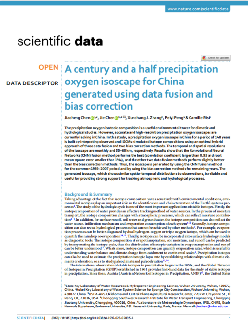 日前,我校西科院科研团队与武汉大学水利水电学院陈杰课题组合作,在Nature子刊Scientific Data在线发表了题为“A century and a half precipitation oxygen isoscape for China generated using data fusion and bias correction”的论文。
