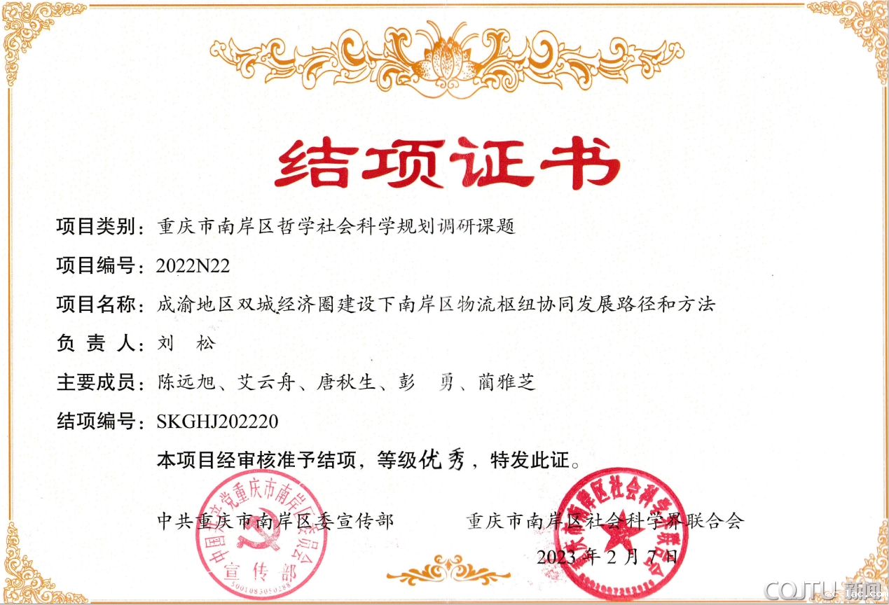 2022年9月,重庆市南岸区社会科学界联合会发布了《关于做好2022年区社科规划调研课题结题工作的通知》。近日,经过评审,交通运输学院刘松、唐秋生、彭勇和蔺雅芝等完成的重点课题“成渝地区双城经济圈建设下南岸区物流枢纽协同发展路径和方法”荣获“南岸区哲学社会科学规划优秀调研课题”。