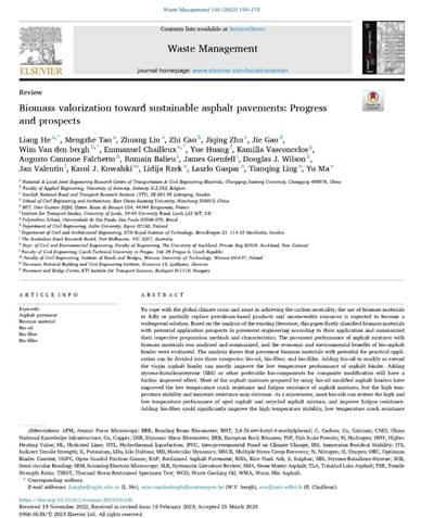 近日,我校土木工程学院何亮教授联合全球15国科学家在环境工程领域顶级期刊《Waste Management》(中科院SCI一区,IF8.816)上发表题为“Biomass valorization toward sustainable asphalt pavements: Progress and prospects”(Volume 165, 15 June 2023, Pages 159-178)的长篇学术论文。我校何亮教授为第一作者和通讯作者,我校交通土建工程材料国家地方联合工程研究中心为第一完成单位。