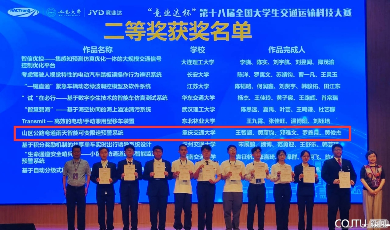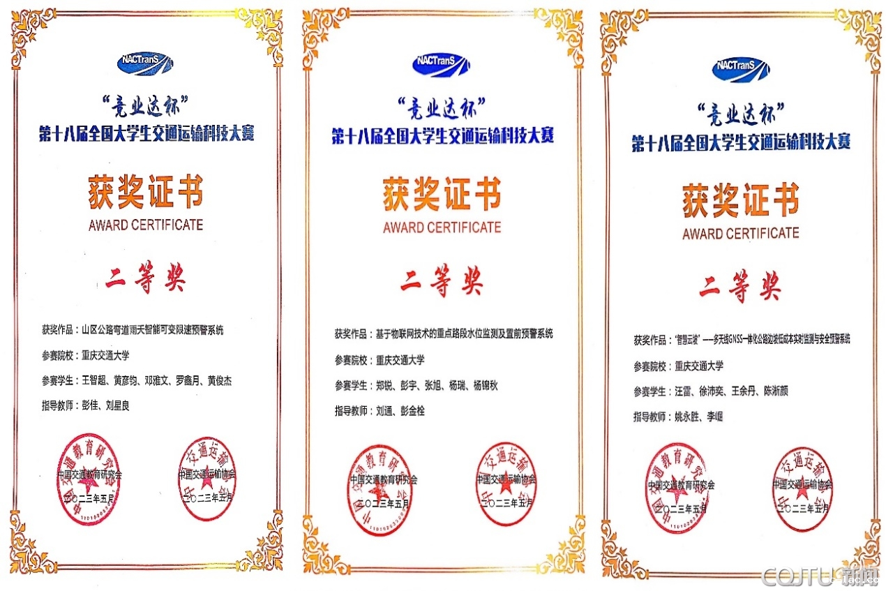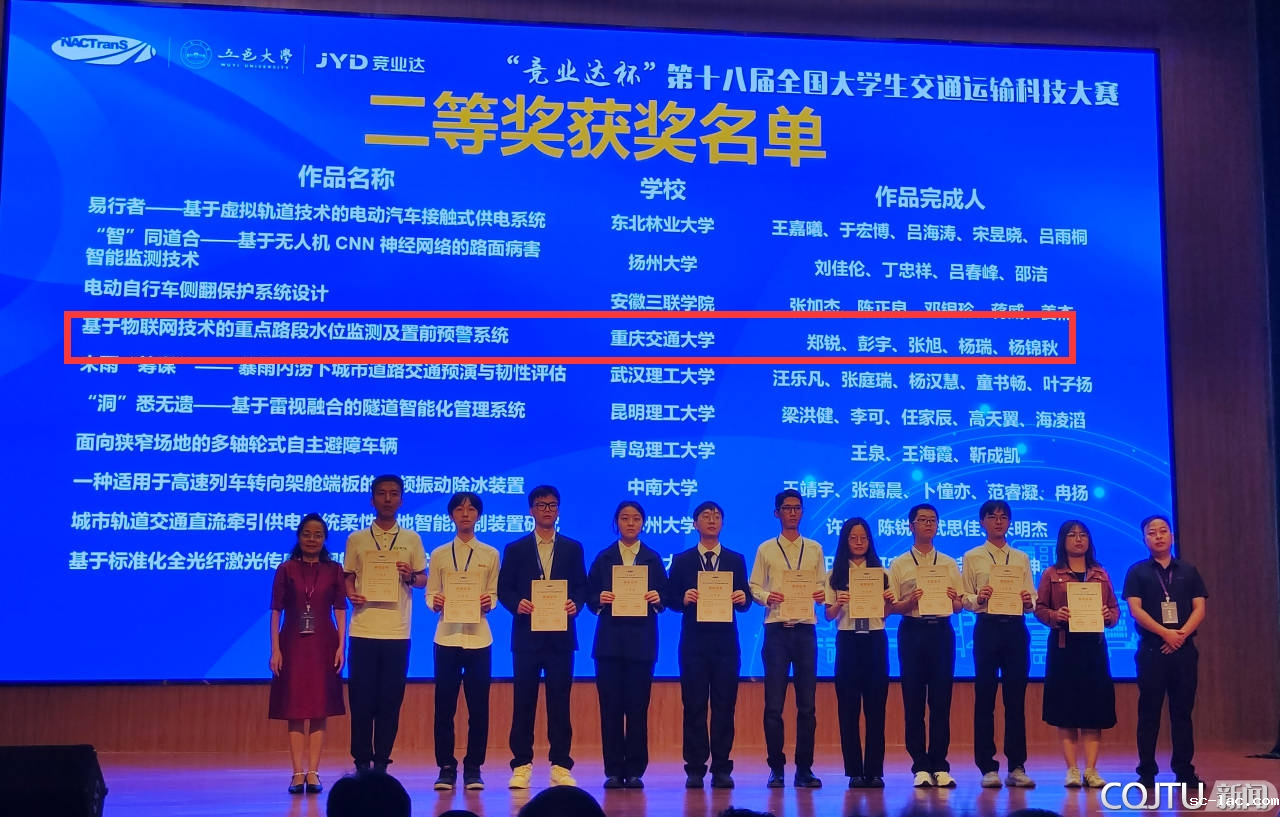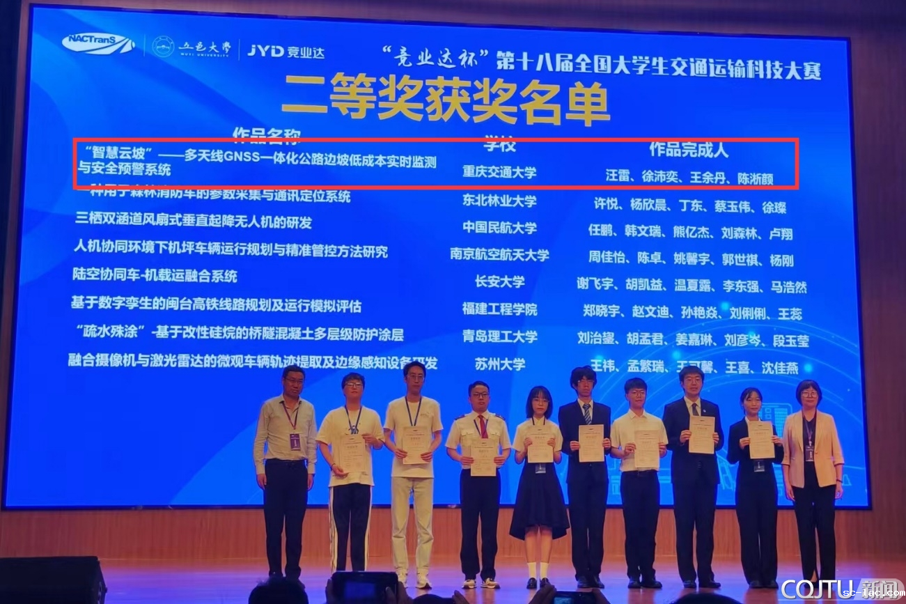 喜获全国二等奖的三个件作品分别是由交通运输学院彭佳博士、刘星良博士指导,王智超、黄彦钧等5位同学完成的“山区公路弯道雨天智能可变限速预警系统”;刘通博士、彭金栓教授指导,郑锐、彭宇等4位同学完成的“基于物联网技术的重点路段水位监测及置前预警系统”;姚永胜教授、李崛副教授指导的汪雷、徐沛奕等4位同学的“‘智慧云坡’——多天线GNSS一体化公路边坡低成本实时监测与安全预警系统”。