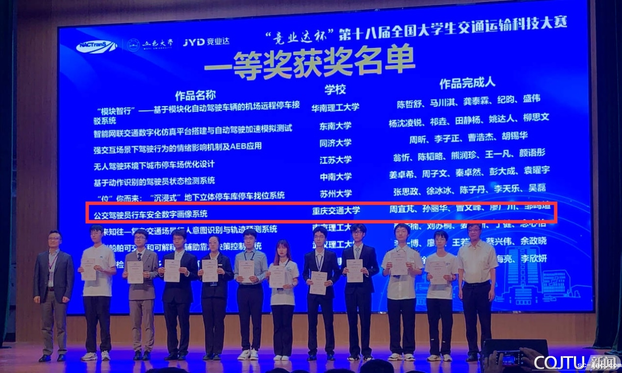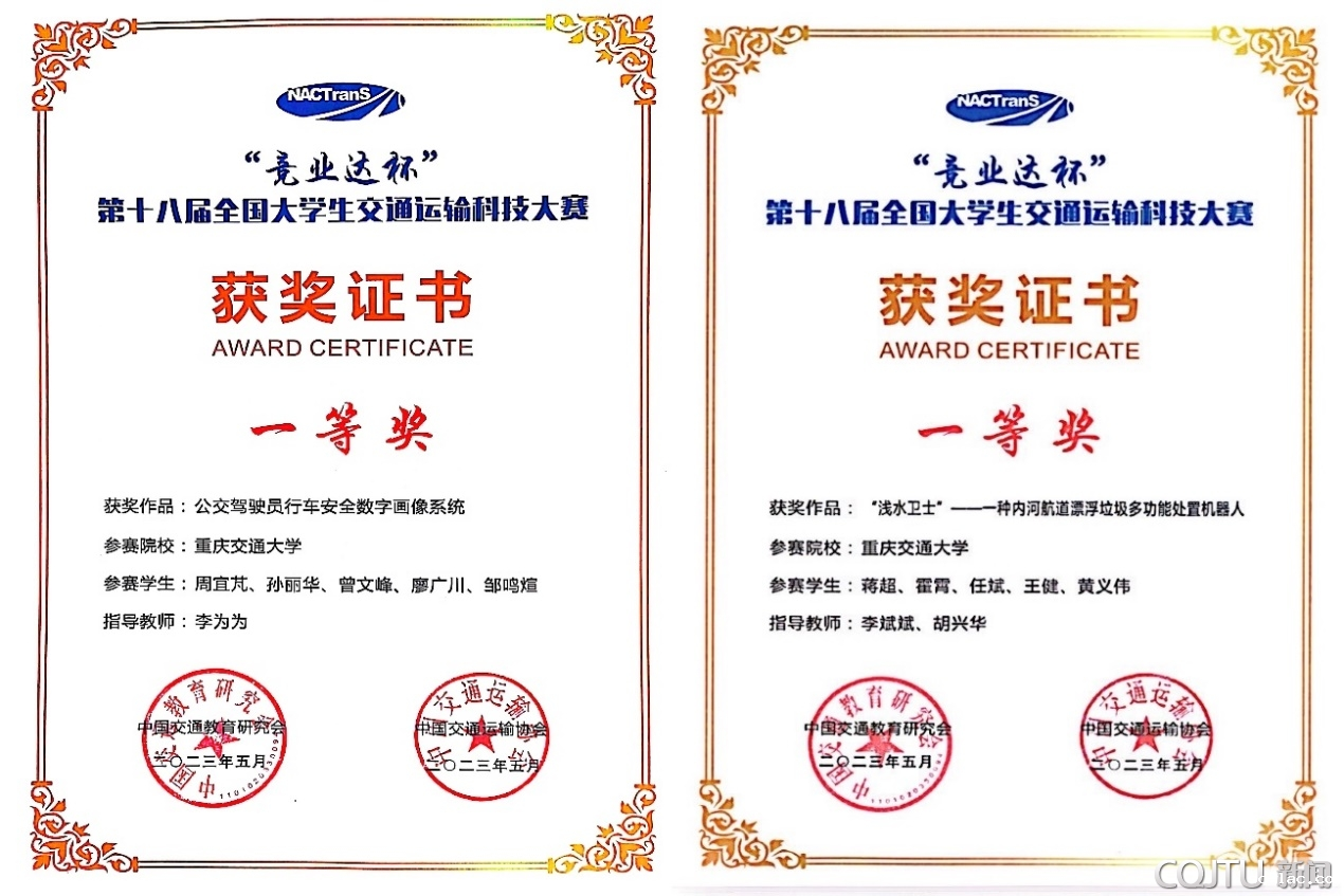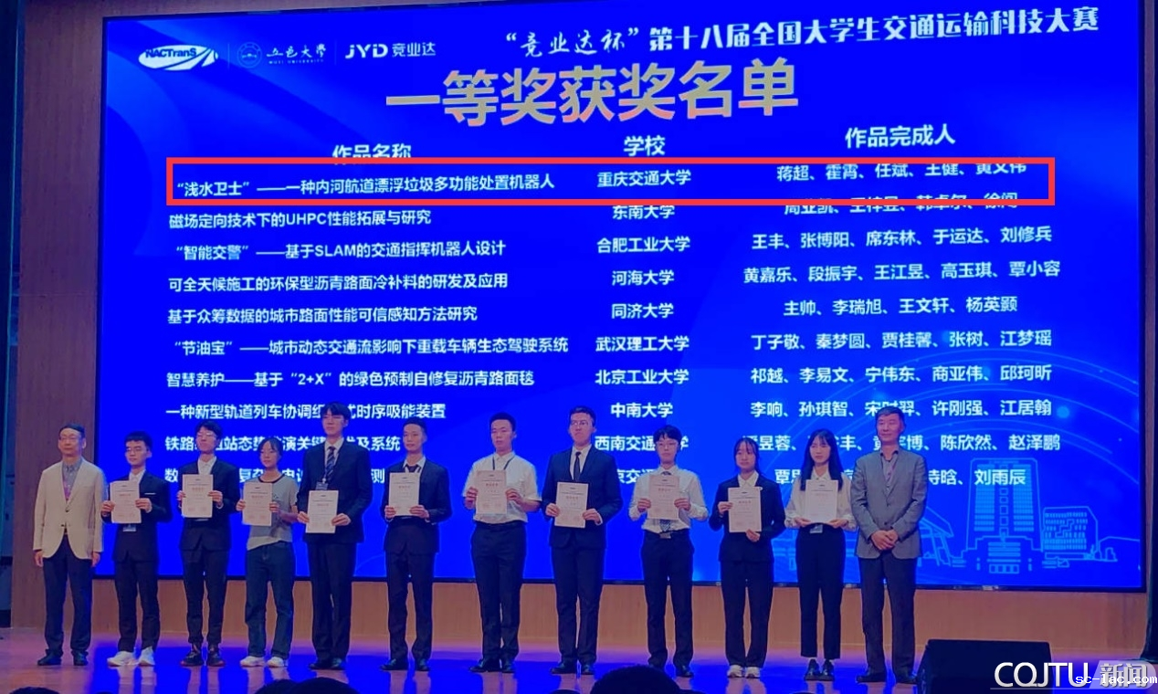 其中,喜获全国一等奖的两件作品分别是交通运输学院李为为教授指导,周宜芃、孙丽华等5位同学完成的“公交驾驶员行车安全数字画像系统”和李斌斌博士、胡兴华教授指导,蒋超、霍霄等5位同学完成的“‘浅水卫士’——一种内河航道漂浮垃圾多功能处置机器人”。