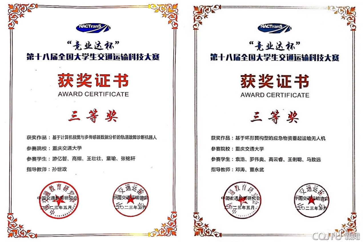 喜获全国三等奖的两件作品分别是机电与车辆工程学院孙世政教授指导的游亿哲、高煊等5位同学的“基于计算机视觉与多传感器数据分析的轨道故障诊断机器人”和航空学院邓涛教授、董永武博士指导的袁浩、罗伟奥等5位同学的“基于环形翼构型的应急物资垂起运输无人机”。