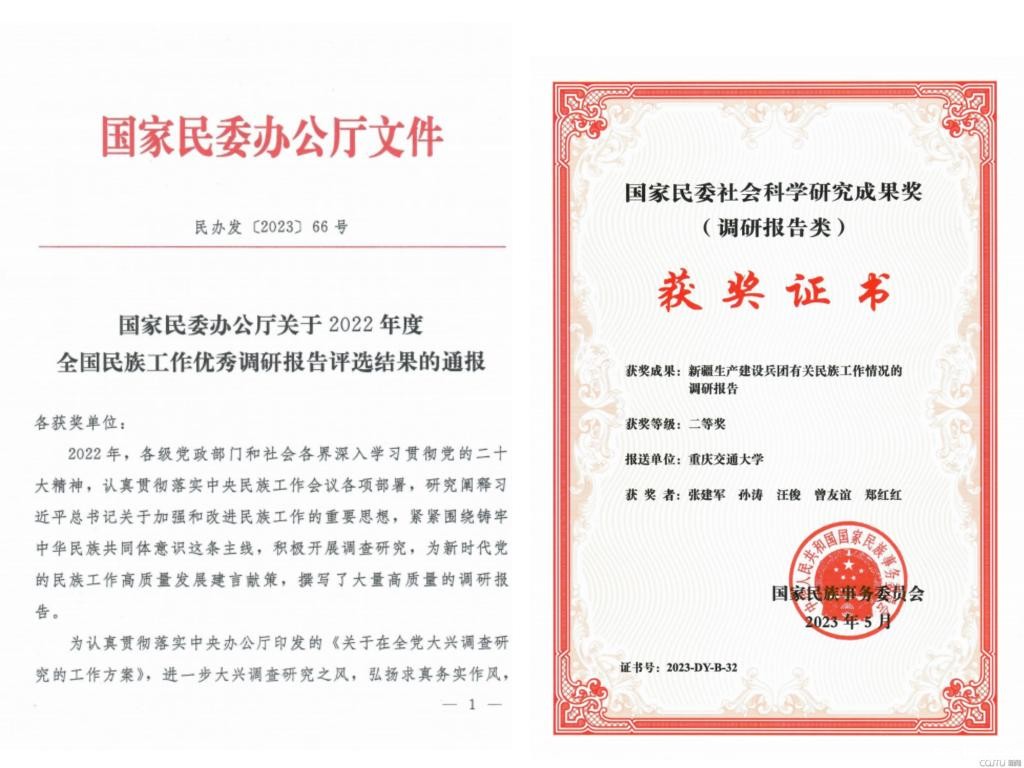 国家民委社会科学研究成果奖是由国家民族事务委员会设立的民族工作研究成果最高级别奖项,是认真贯彻落实中央办公厅印发的《关于在全党大兴调查研究的工作方案》,弘扬求真务实作风,推动新时代党的民族工作高质量发展的重要举措。此次全国共评选出获奖调研报告200篇,其中一等奖20篇、二等奖40篇。重庆有重庆大学和我校获奖。此次获奖,是我校在该奖项评选中首次获奖。