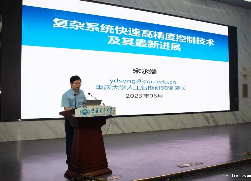 宋永端以“高性能控制技术及最新进展”为题作报告,对高性能控制、有限时间控制、非线性非最小相位系统输出调节控制等概念作了深度阐释。