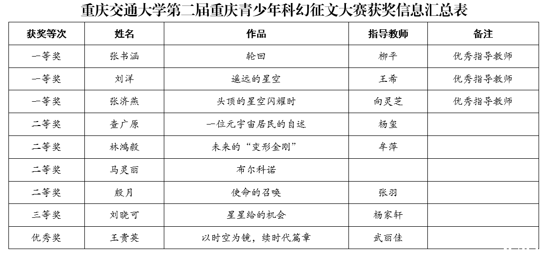近日,重庆市科学技术协会公布了第二届重庆青少年科幻征文大赛、第三届重庆市科学道德和学风建设辩论赛结果,我校科协高度重视两项大赛为同学们提供的价值引导、促进大家全面发展的重要意义,第一时间开展全校宣传动员,积极协调校团委等单位组织学生参赛。同学们积极参与,取得了良好效果,9支队伍分获第二届重庆青少年科幻征文大赛表彰,柳平、王希、向灵芝3位教师获优秀指导教师。我校获第二届重庆青少年科幻征文大赛、第三届重庆市科学道德和学风建设辩论赛2两项优秀组织奖。