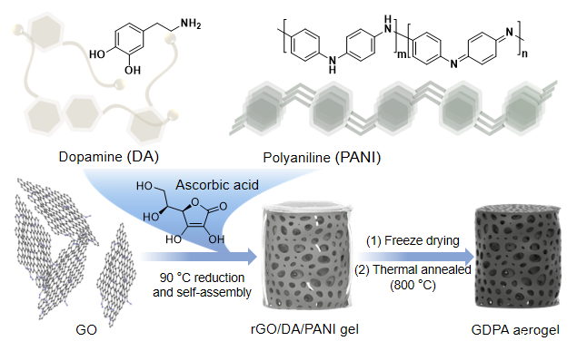 该论文提出了一种具有“软段”和“硬段”共同调控气凝胶微观结构的还原氧化石墨烯气凝胶均匀多孔复合材料(GDPA)的新设计,用于灵敏柔性传感器的应用。通过整合还原氧化石墨烯(RGO)的机械性能和导电性能、内部独特微孔结构RGO框架的气凝胶/多巴胺和聚苯胺调节以及高温热退火,该GDPA可以作为一种有效的压力传感器件,用于智能可穿戴设备。该多功能GDPA器件不仅可以具备优秀的力学和导电性能,可以在长时间压缩循环后依然保持稳定的机械柔韧性和导电能力,同时,还具备宽的检测范围(0-25.48kPa)和高灵敏度(0.17kPa-1)。GDPA复合气凝胶在各种人体信号检测和工作稳定性均表现出令人满意的综合性能。研究表明,采用多巴胺和聚苯胺共同调节石墨烯气凝胶内部结构,氧化石墨烯与多巴胺和聚苯胺材料复合后同时满足了机械柔韧性、高导电能力等多种需求,该研究为制造高灵敏度的压力传感器应用提供了新思路。