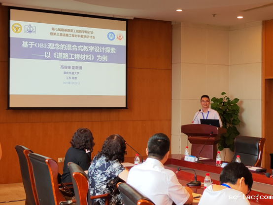 在道路工程材料专题会场,高俊锋副教授应邀作了题为“基于OBE理念的混合式教学设计探索——以《道路工程材料》为例”的报告。报告将OBE理念与混合式教学融为一体,以《道路工程材料》为例,全方位展示了“以学生为中心”的教学设计,得到了与会专家、学者的充分肯定。