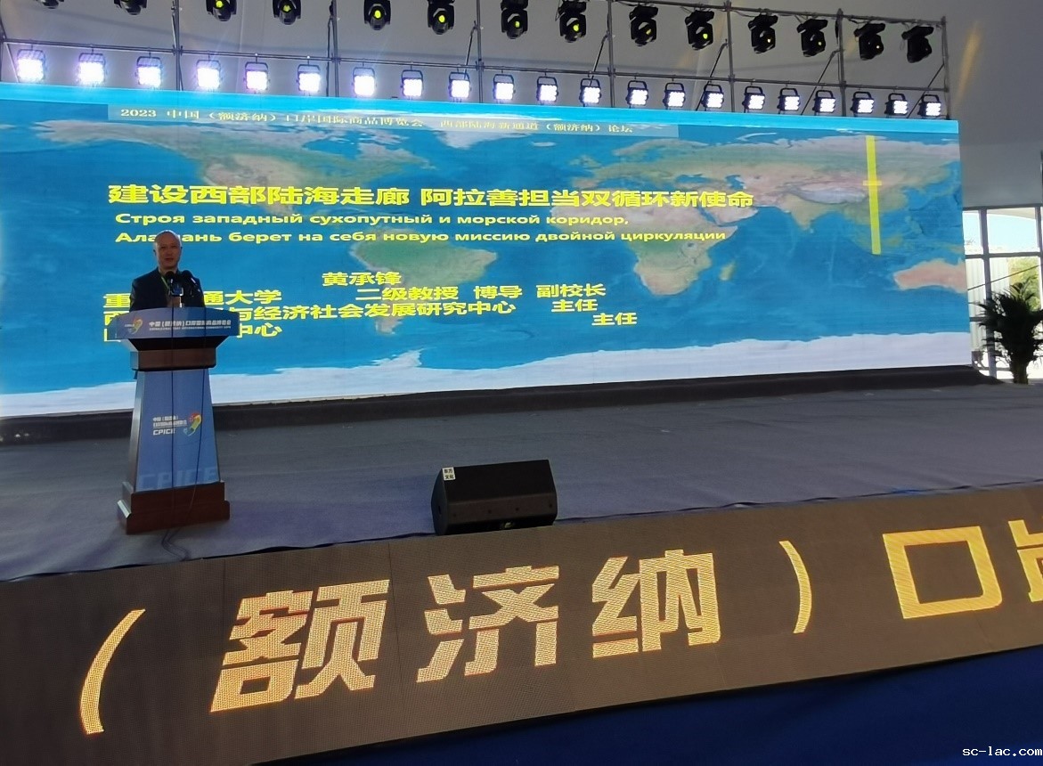 下午,西部陆海新通道——阿拉善盟对外开放新机遇主题论坛在额济纳旗居延文化城会展中心A馆举行,黄承锋教授向大会作《建设西部陆海走廊 阿拉善担当双循环新使命》报告。