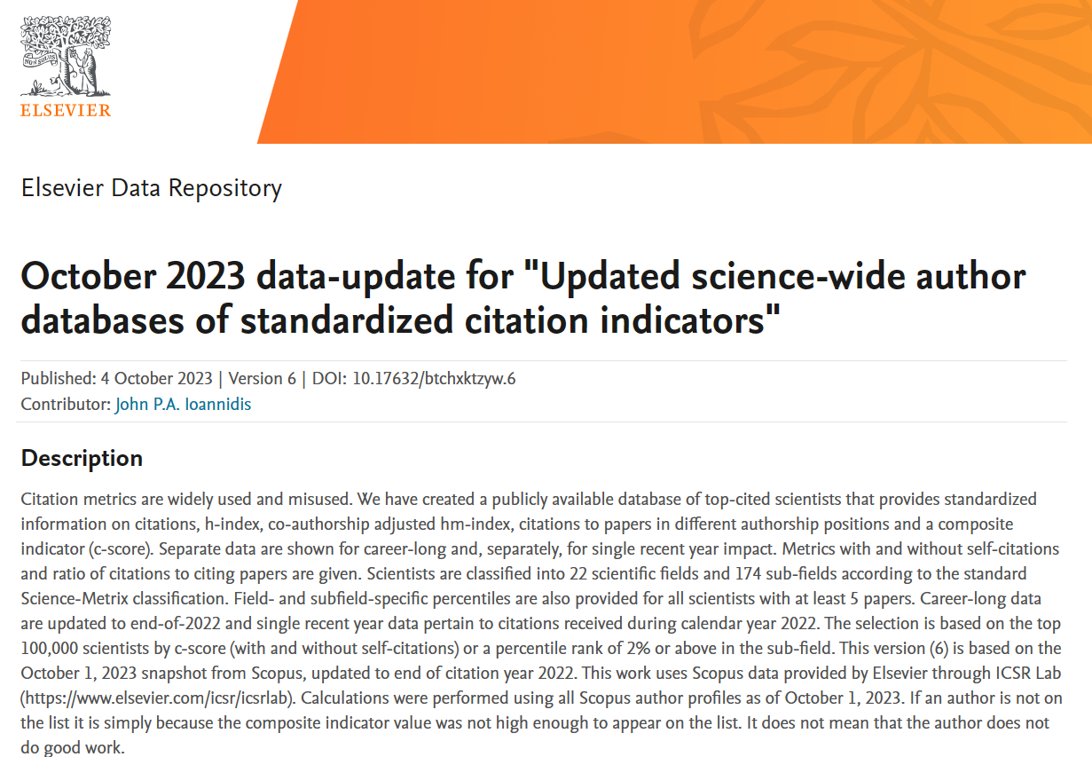 2023年10月4日,美国斯坦福大学和爱思唯尔数据库(Elsevier Data Repository)发布了《全球前2%顶尖科学家榜单(1960-2022年)》和《全球前2%顶尖科学家榜单(2022年度)》。