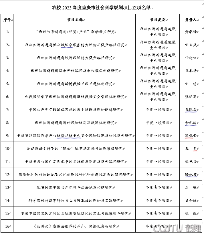 近日,重庆市社会科学规划办公室公布了“2023年度重庆市社会科学规划项目立项名单”,我校获批6项西部陆海新通道建设重大项目,占全市西部陆海新通道建设重大项目立项总数十四项的42.86%,立项数在重庆高校中位居第一,同时,年度项目立项数也列于市属高校前列。