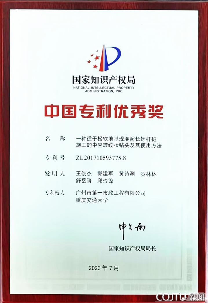 近日,老伟德网上娱乐材料学院王俊杰教授团队荣获第二十四届中国专利优秀奖,获奖专利名称为“一种适于松软地基现浇超长螺杆桩施工的中空螺纹状钻头及其使用方法”,专利号为ZL201710593775.8。