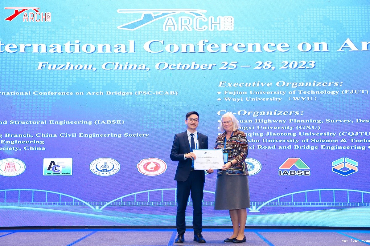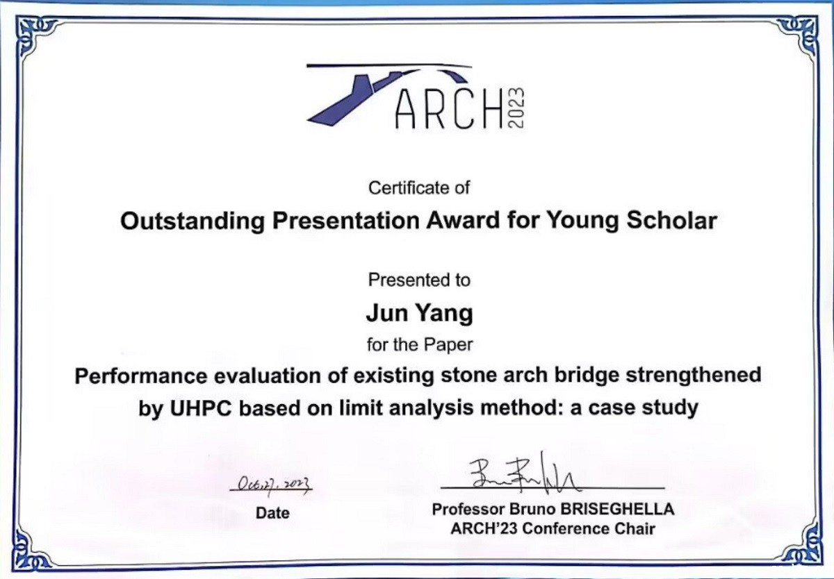 杨俊教授和Bijaya Jaishi教授主持了分会场一,杨俊教授作了“Performance Evaluation of Existing Stone Arch Bridge Strengthened by UHPC Based on Limit Analysis Method: A Case Study”的分会场报告,详细阐述了利用UHPC材料加固拱桥的技术原理和计算理论,最终荣获本次大会的“Outstanding Presentation Award for Young Scholar”青年学者杰出报告奖。此外,我校博士生冷景晨作了“Research and Practice on Strengthening Masonry Arch Bridges by UHPC”的分会场报告。