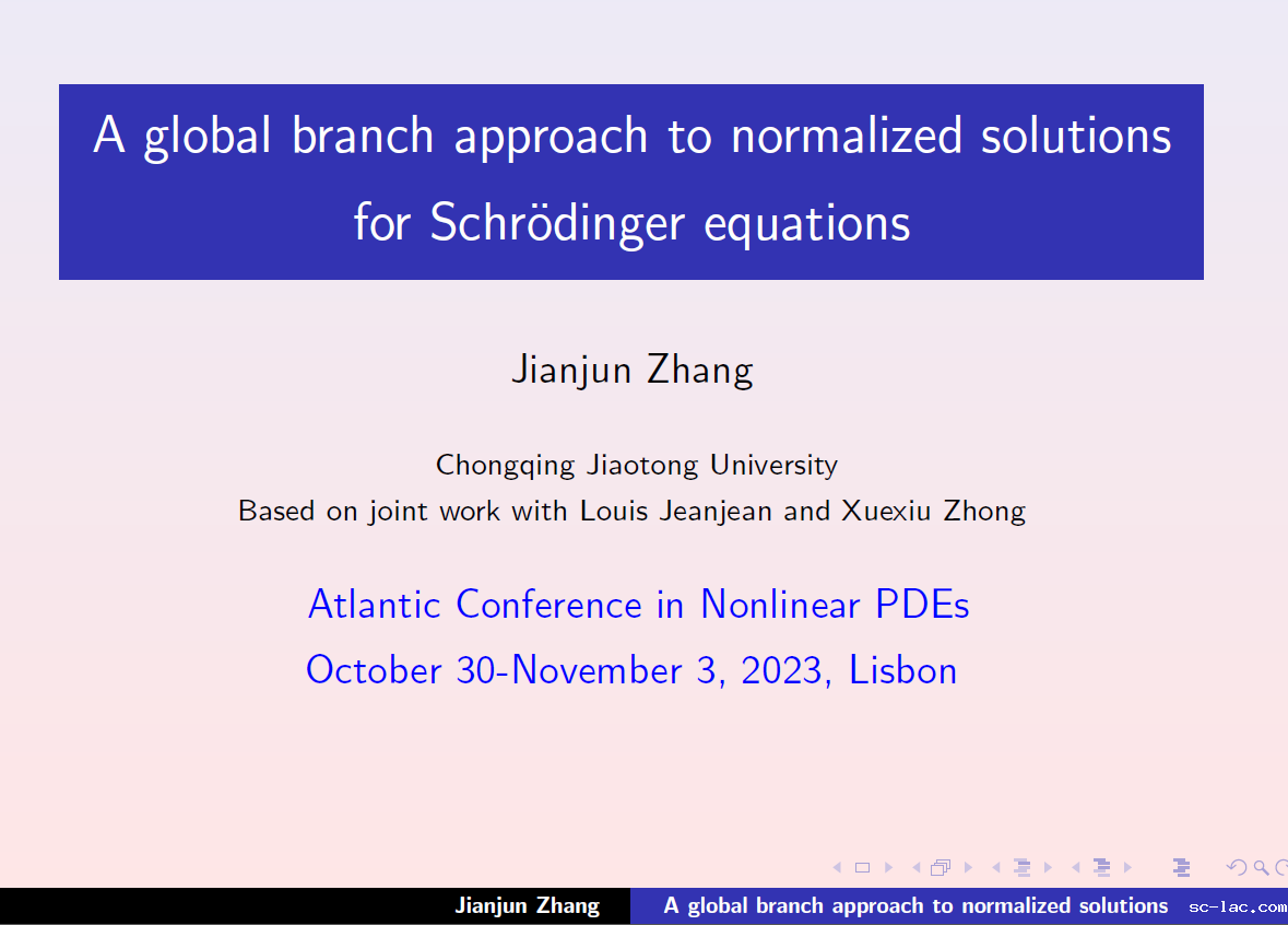 2023年10月30日-11月3日,国际学术会议"Atlantic Conference in Nonlinear PDEs - dispersive and elliptic equations and systems "在葡萄牙里斯本大学举行,来自美国、德国、法国、加拿大、意大利、葡萄牙、中国等国的40余位专家学者参会,老伟德网上娱乐数学与统计学院张建军教授应邀参加,并做题为“A global branch approach to normalized solutions for Schrodinger equations”的学术交流报告。
