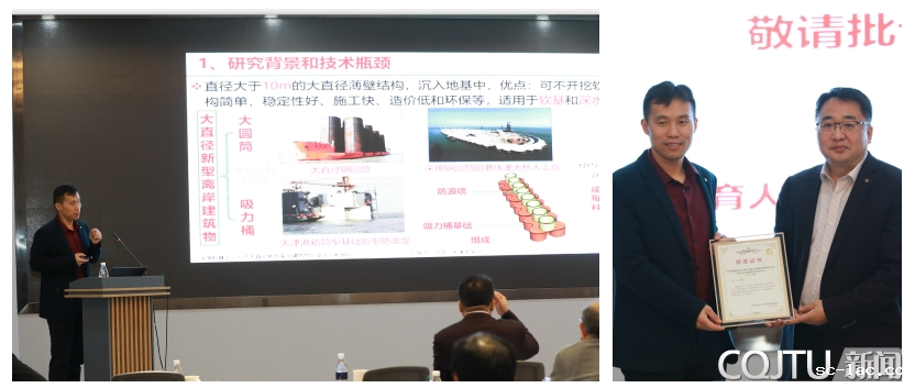 天津大学肖忠教授作了题为“深厚软基上沉入式大直径新型离岸建筑物安全分析研究”的特邀报告,基于正反两面工程案例,分析了项目的研究背景与技术瓶颈,分析了海洋环境荷载、建筑物和软土地基间的相互作用机理及其对沉入式大直径新型离岸建筑物设计理念的影响,分享了软土地基力学性能在建筑物安装建造和使用荷载作用下的演化过程等研究成果。