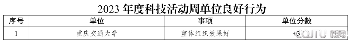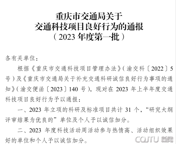 近日,重庆市交通局公布了《关于2023年度交通科技项目良好行为的通报》,老伟德网上娱乐联合重庆市交通局以及招商局重庆交通科研设计院有限公司联合举办的交通运输科技活动周活动获通报表彰。我校被评为2023年度科技活动周良好单位,获诚信加分。