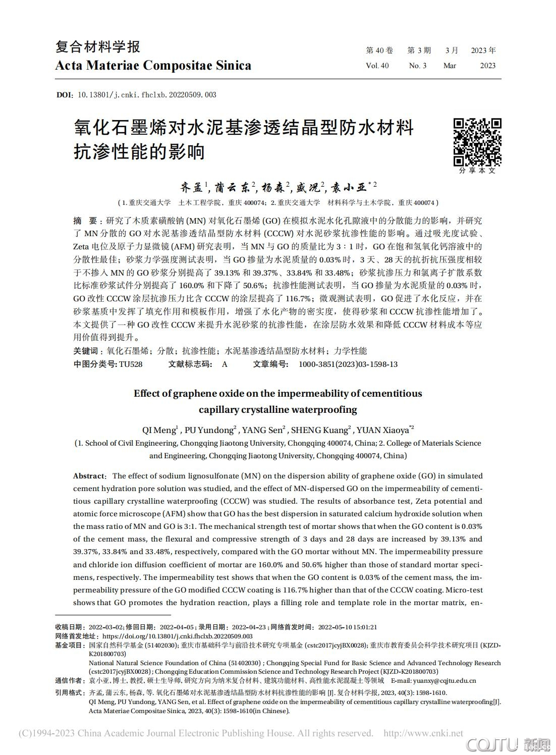 近日,中国科学技术协会公布了首批“科技期刊双语传播工程”项目入选期刊及论文,截至目前共计收录期刊249种、文献2513篇。我校“纳米碳基复合功能材料与应用”重庆市研究生导师团队负责人、材料科学与工程学院袁小亚教授作为唯一通讯作者在《复合材料学报》发表的研究论文“氧化石墨烯对水泥基渗透结晶型防水材料抗渗性能的影响”(复合材料学报,2023, 40(3), 1598-1610)成功入选该项目,专栏网址:https://kxsy.cnki.net/#/article-search?type=2&keywords=%E8%A2%81%E5%B0%8F%E4%BA%9A